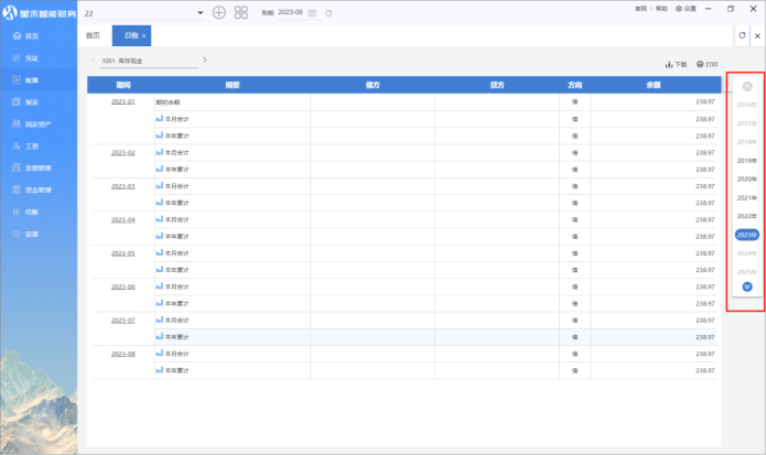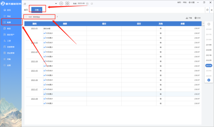 (2) 右侧有年度时间轴,可以切换不同年度,按年查询总账。