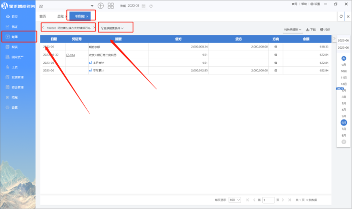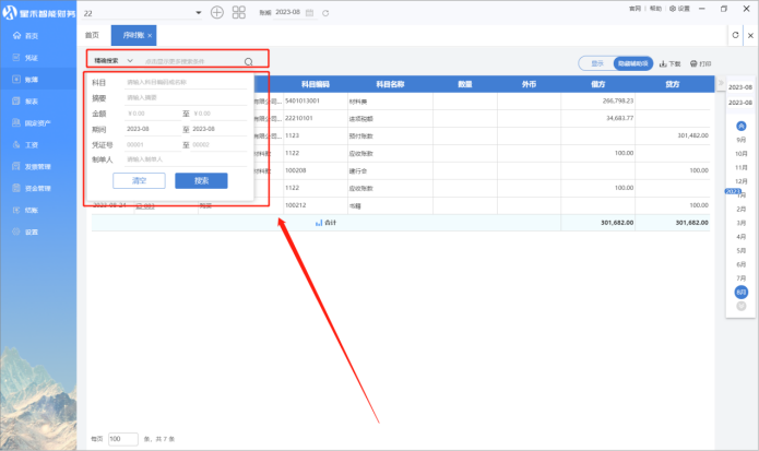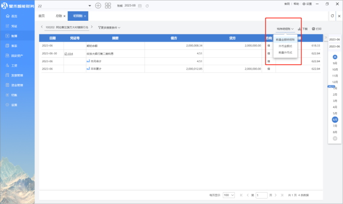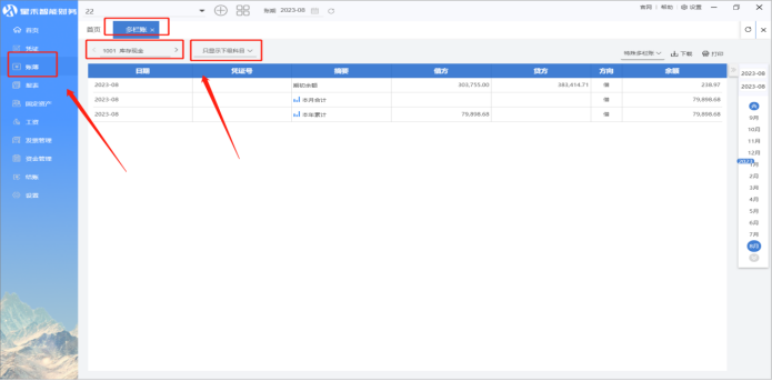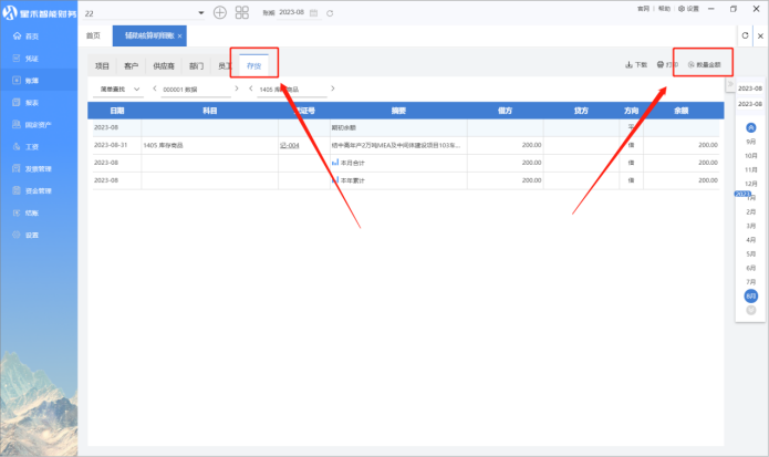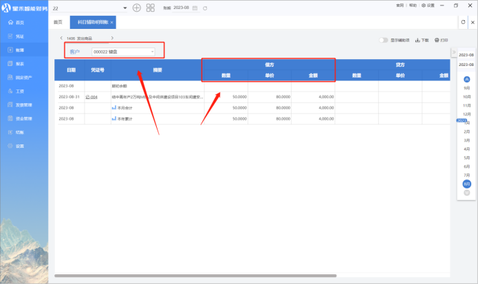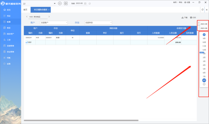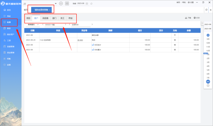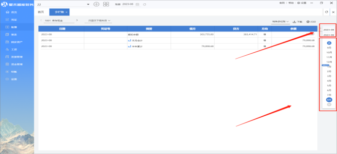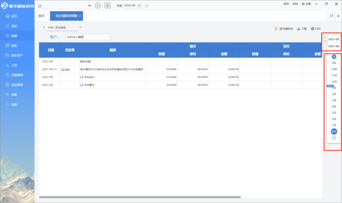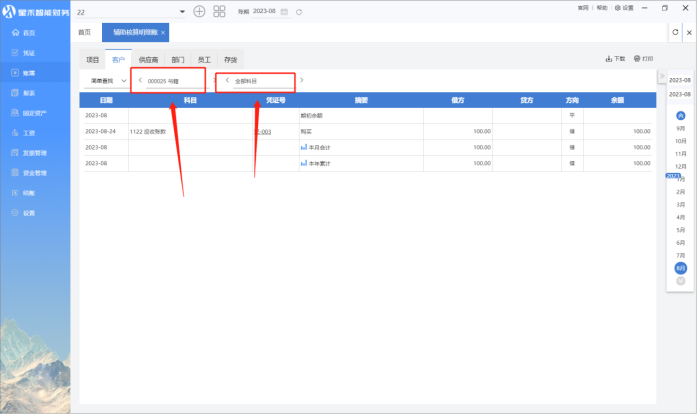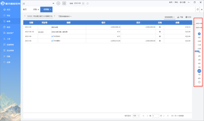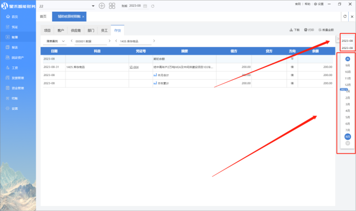 ( 2)右上角有年月起止时间选择功能,右侧有月份时间 轴,可以按区间或月份查询明细账。