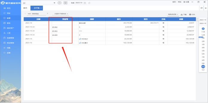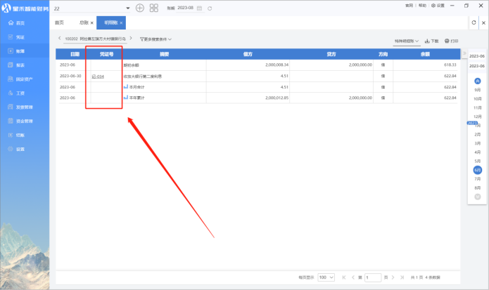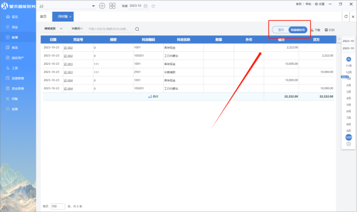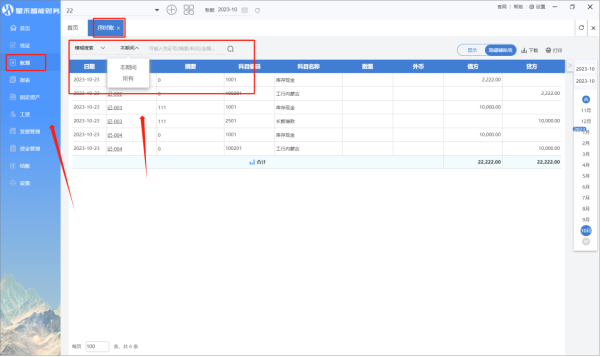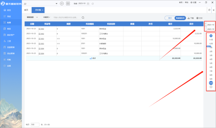 (3) 右上角有年月起止时间选择功能, 右侧有月份时间轴,可以按区间或月份查询序时账。