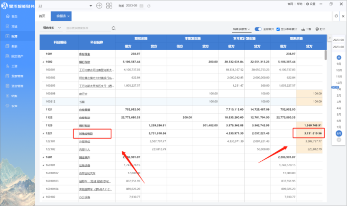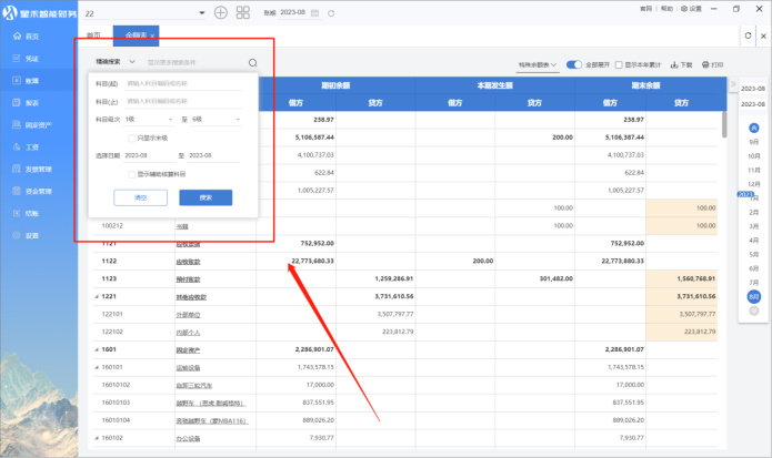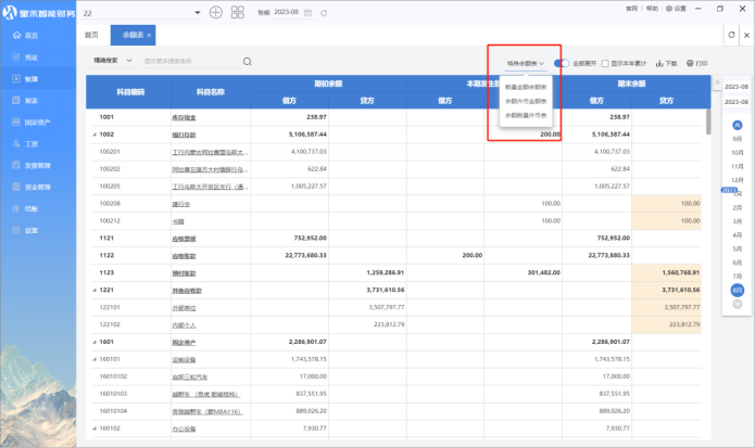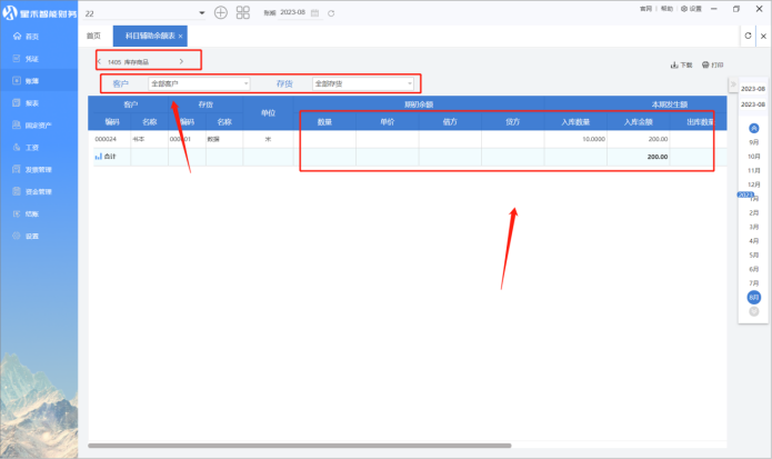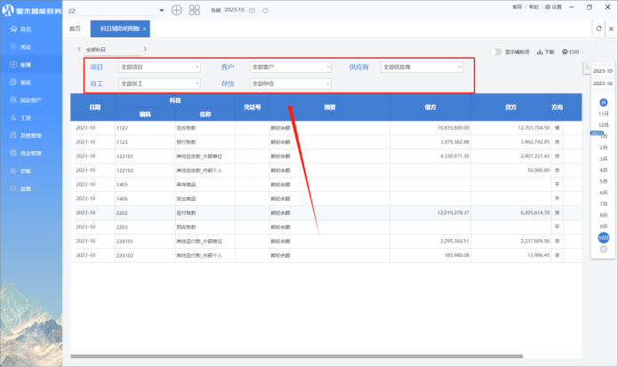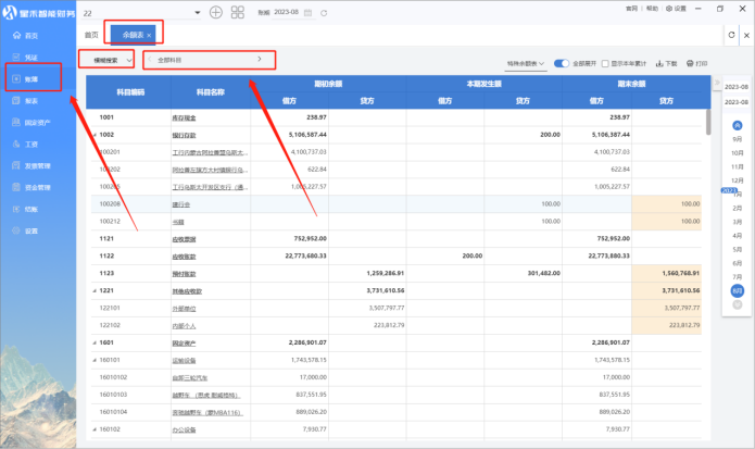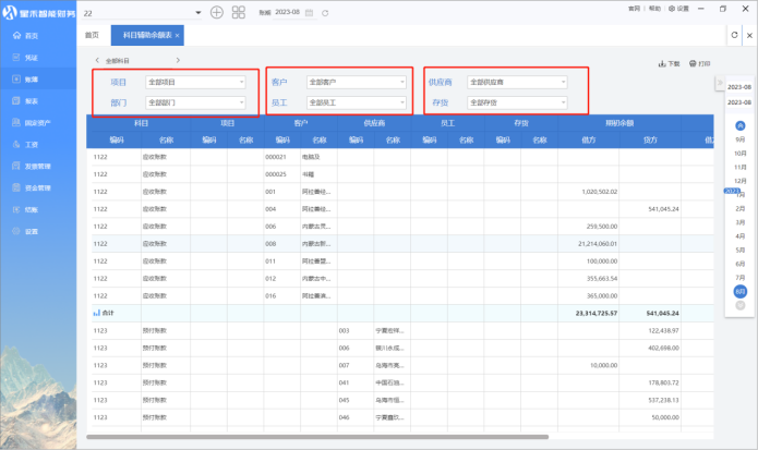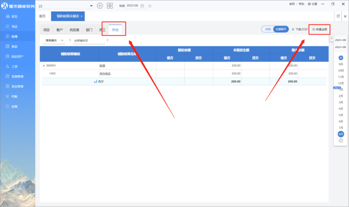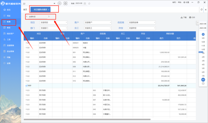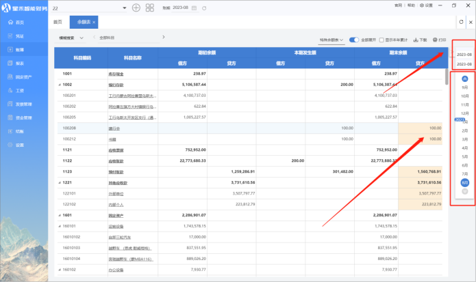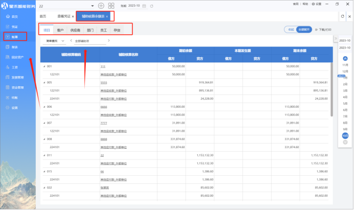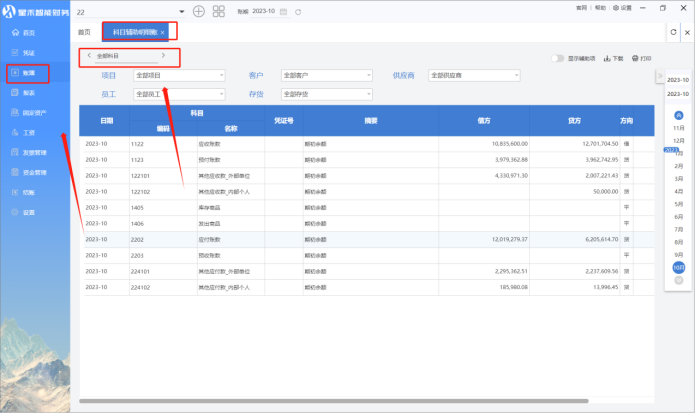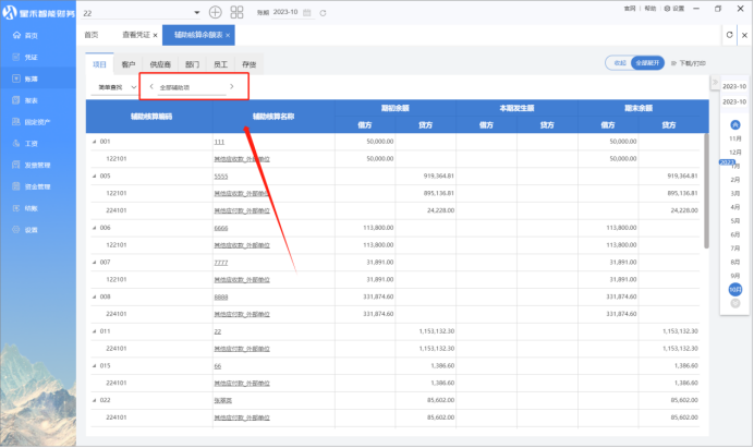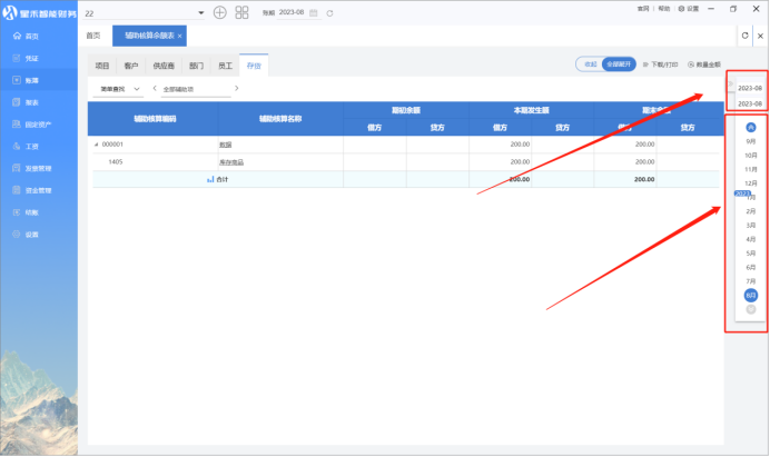(3) 右上角有年月起止时间选择功能,右侧有月份时间轴,可以按区间或月 份查询科目辅 助余额表。