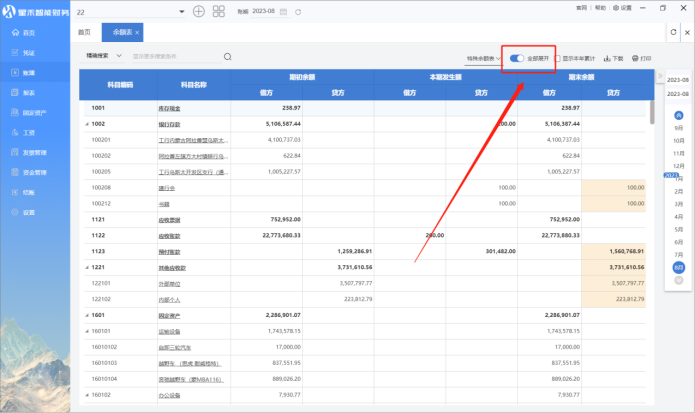 (5) 右上角【全部展开】切换到右侧,余额表可以显示 所有级次科目,切换到左侧,余额 表只显示一级科目。