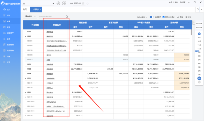 (8) 右侧金额上显示【黄色】,表示该科目的期末余额 为负数,方便查看科目的余额情况。