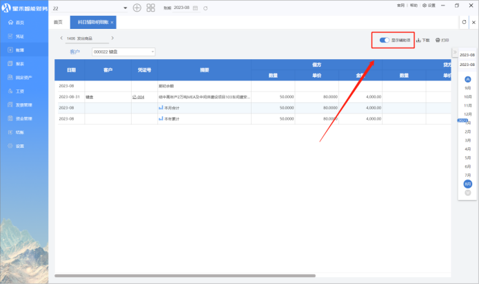 ( 4 ) 右上角有年月起止时间选择功能,右侧有月份时间轴,可以按区间或月 份查询辅助核 算明细账。