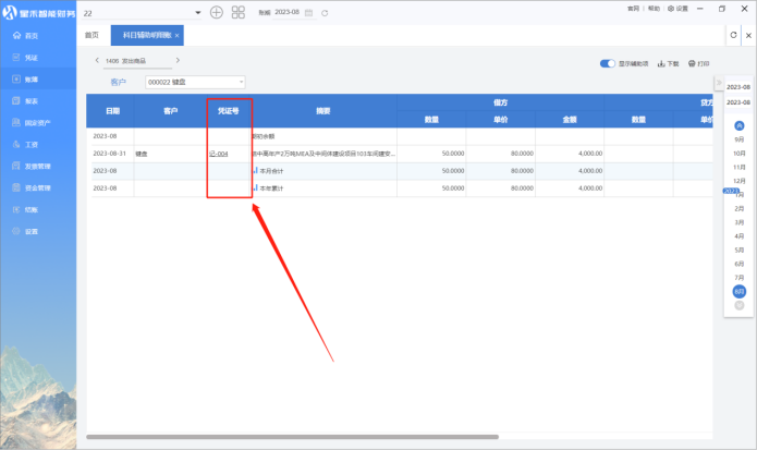 (3) 点击【凭证号】这一列的凭证号,可以联查凭证,支持修改凭证后保存,重算明细账。