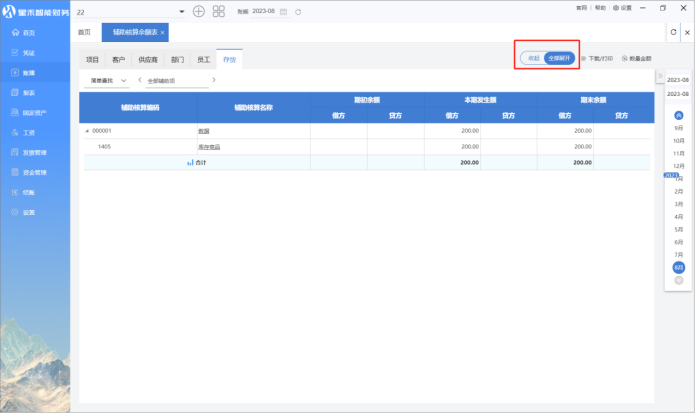 ( 4 )右上角切换为【全部展开】,辅助核算余额表可以显示辅助核算 和科目的数据。右上角切换为【收起】,辅助核算余额表只显示辅助核算的数据。