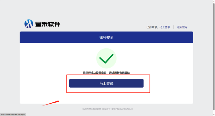 ( 4 ) 修改完成后点击马上登录,输入账号和新密码即可。